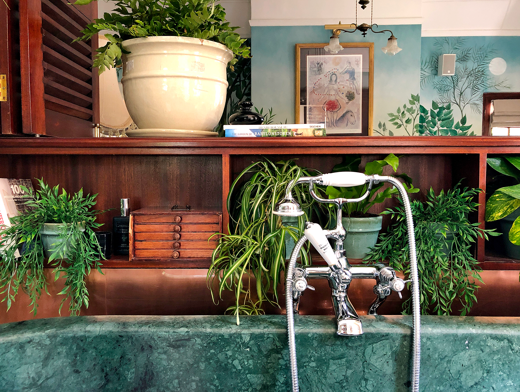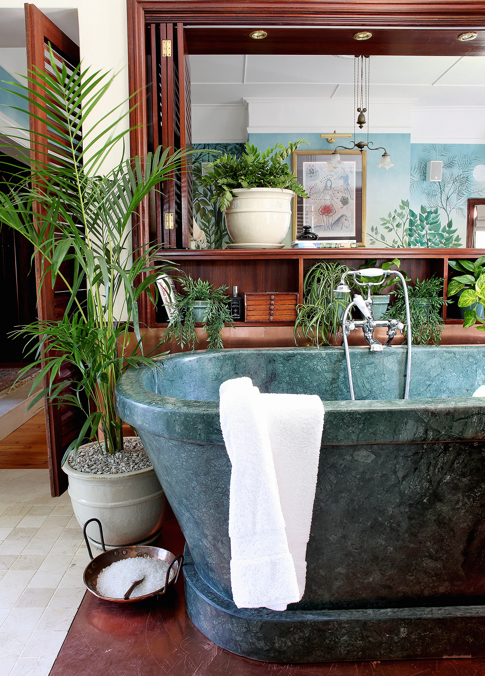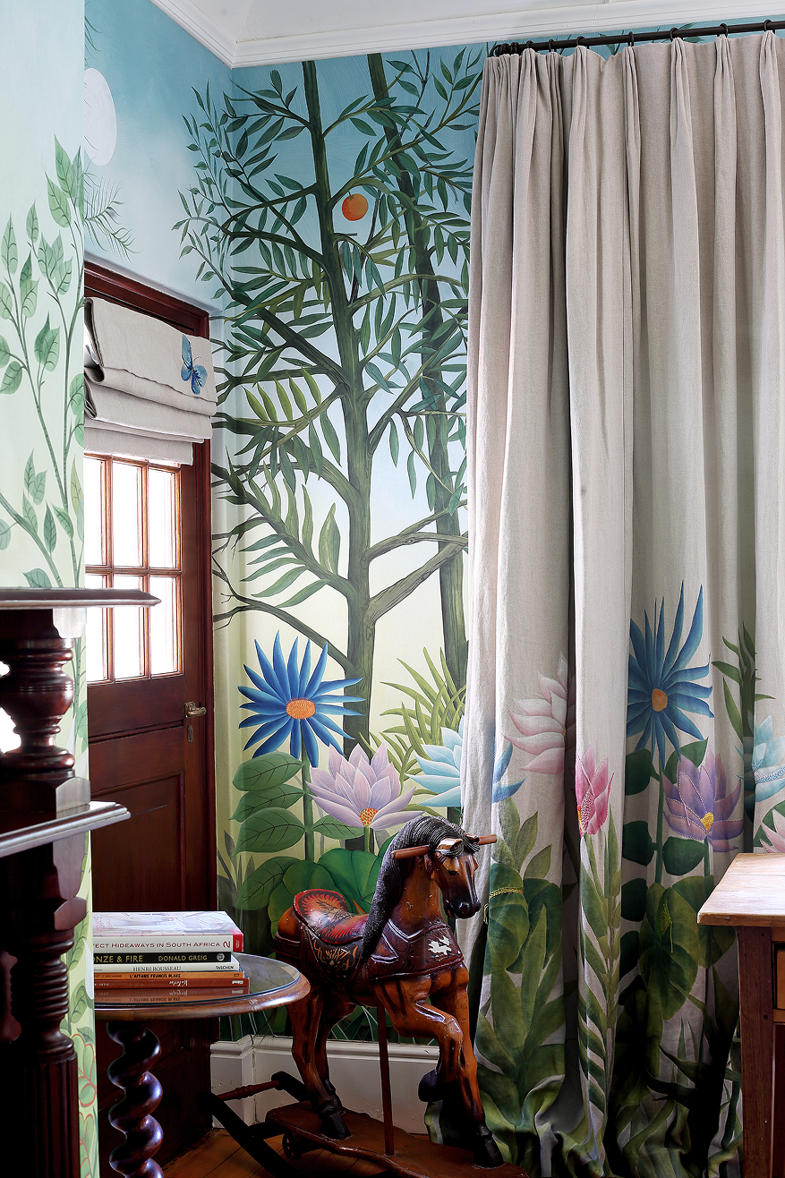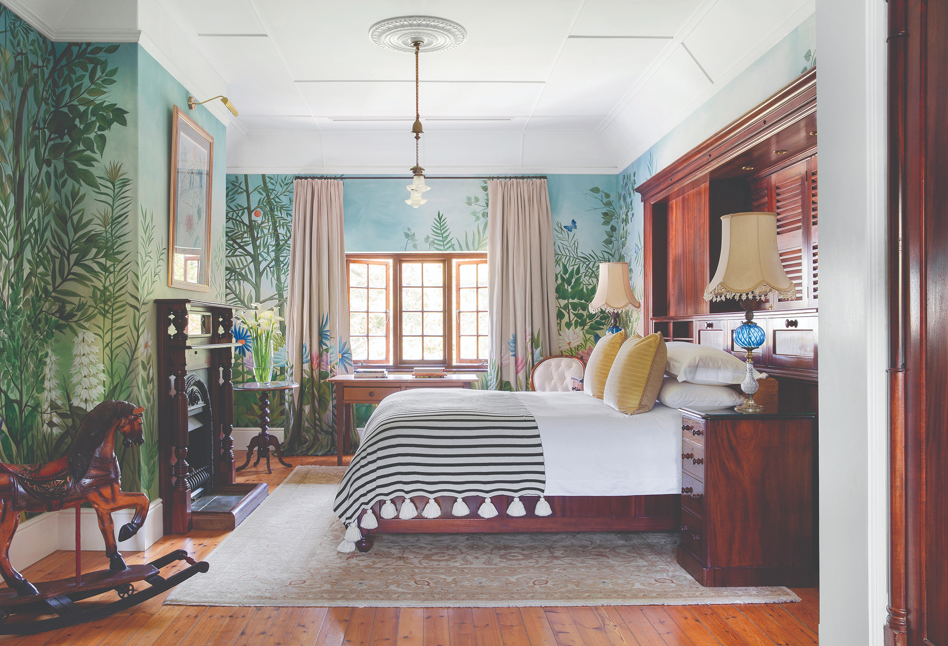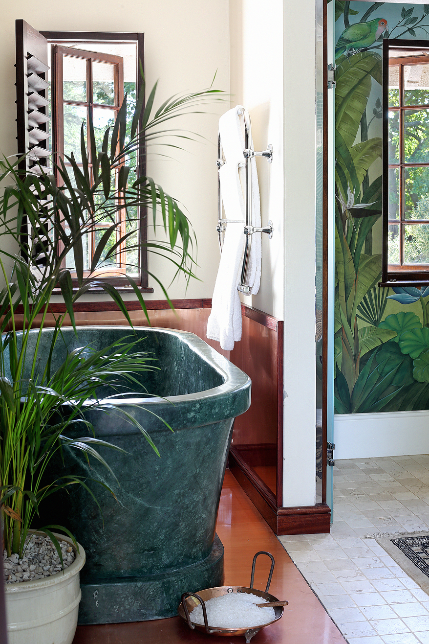 The upstairs master suite features a king-size bed and a spacious bathroom with both a bath and a shower. Jungle scenes by Henri Rousseau were hand-painted by local designers, African Sketchbook. The cheetah and vervet monkey design captures the owner’s love of the African wild. The bath is green marble, handcrafted and shipped from India. It was inspired by the bath tub in Rhodes House in Cape Town, which was designed by Sir Herbert Baker. It brings the garden into the home. There’s a romantic fireplace to keep you toasty.