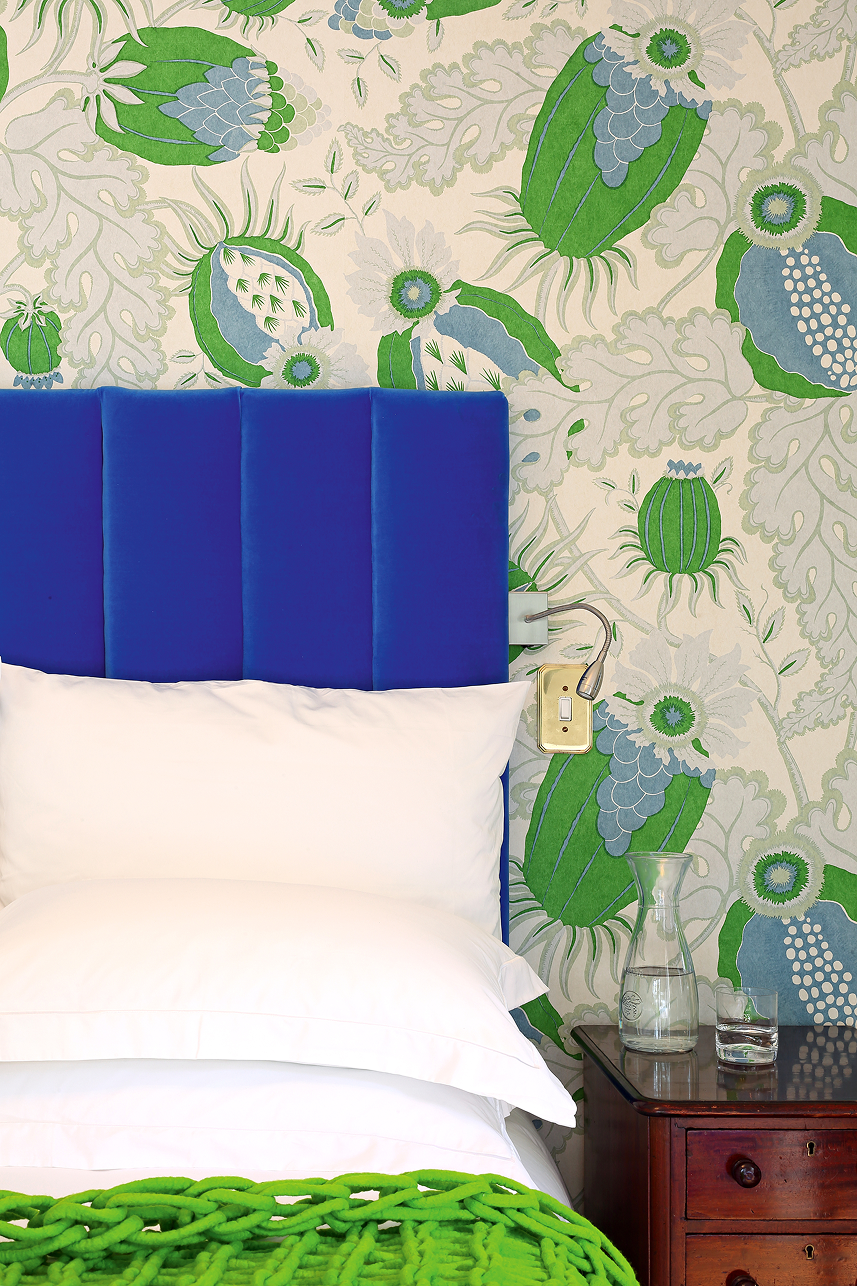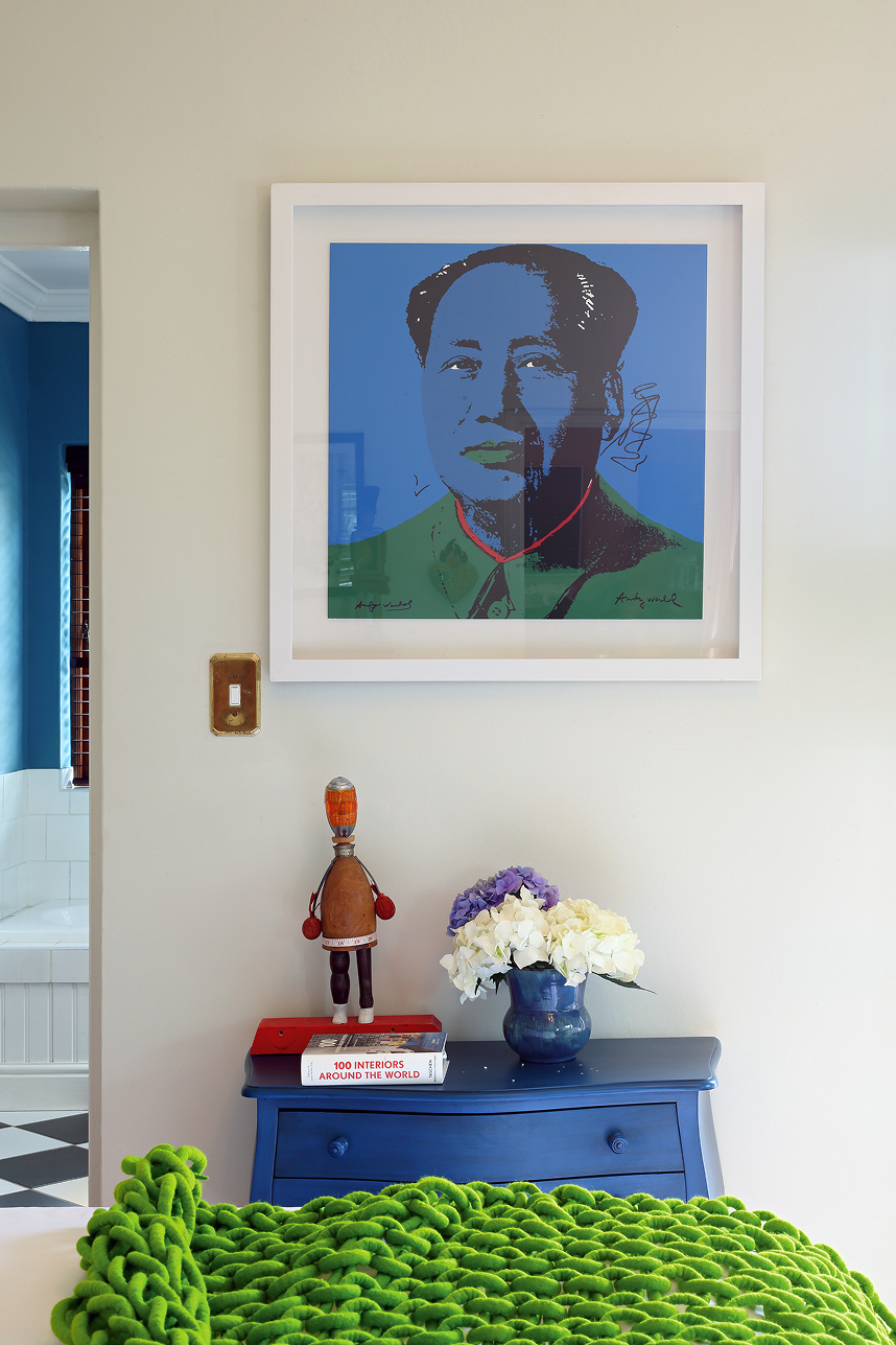 The fresh blue-and-green combination in this upstairs suite includes a double and single bed, with a full bathroom (bath and shower), designed with comfort and practicality in mind. This bedroom is ideal for siblings or cousins, or a couple with one child rooming-in. The Andy Warhol artwork is offset by Christopher Farr ‘Carnival’ wallpaper.