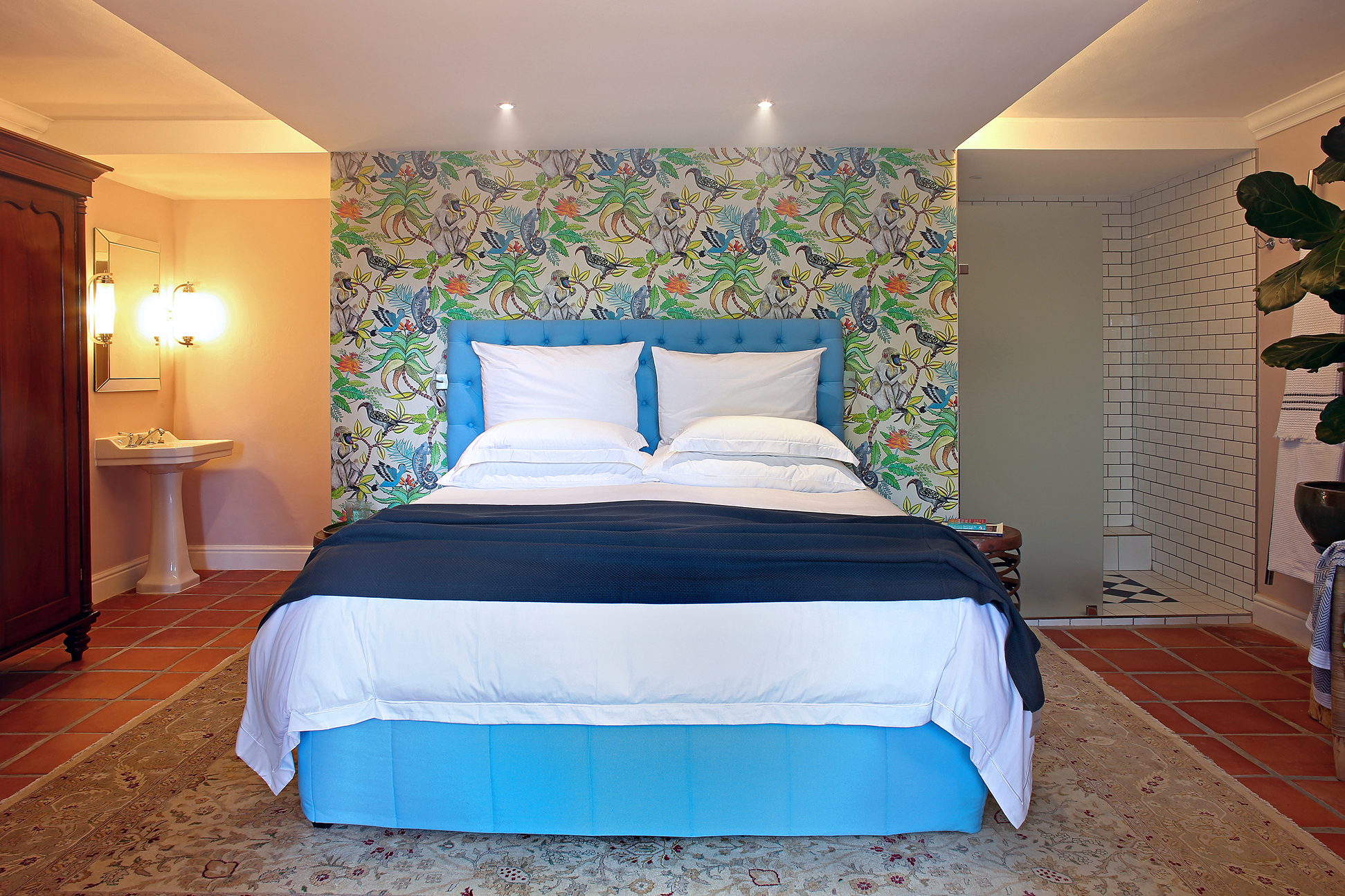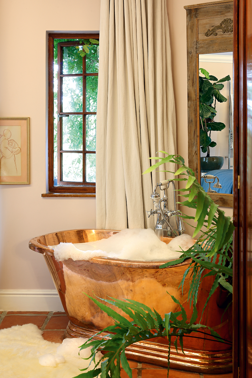 This beautifully appointed room echoes the tranquillity of its surroundings. Featuring a queen-size bed and glamorous copper bath and shower, this ground-floor suite leads out to a private patio close to the steam room and Jacuzzi. The ‘Savuti’ wallpaper panel is by Ardmore and there’s a cosy fireplace for autumn or winter evenings.